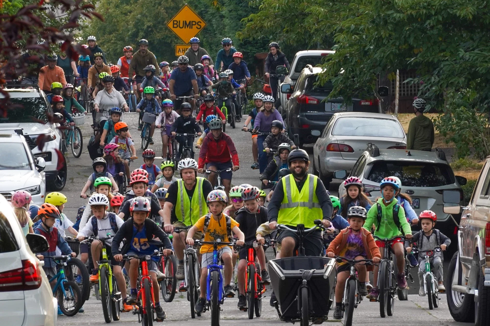 Tot voor kort werden deze kinderen op de achterbank van de auto naar school gebracht. Totdat gymdocent Sam Balto het wel welletjes vond en een Bike Bus startte. Het concept is simpel; samen fietsen langs een vaste route op een vast tijdstip en iedereen die mee wil, haakt aan. Bij gebrek aan goede infrastructuur is een zwerm fietsers een prachtig antwoord.